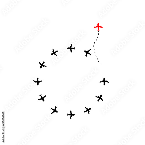 Red airplane changing direction and white ones