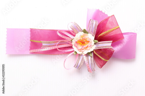 Red and pink satin gift bow. Ribbon. Isolated on white
