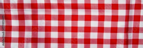 Red and white checkered fabric pattern with a classic gingham design, often used for tablecloths and picnic settings.