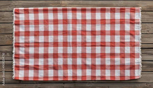 Red and white checkered picnic blanket on wooden surface