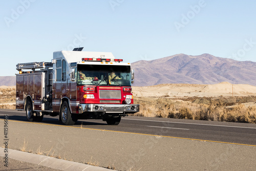 Red and white fire truck driving down a road in the desert responding to an emergency call
