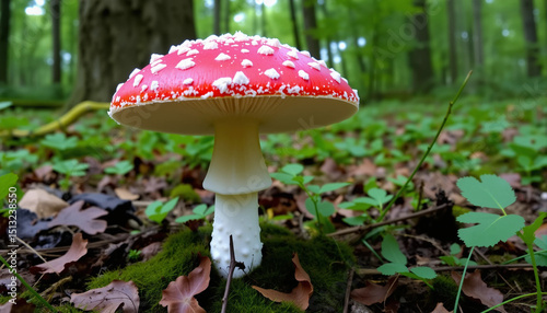 Red and white Fly Agaric mushroom or toadstool in a forest background.
