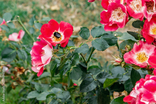 red and white mixed colored roses with bee