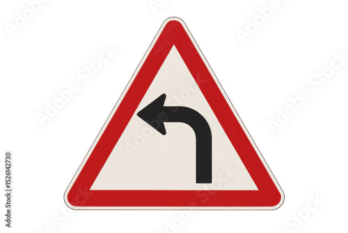 Red and white triangular road sign indicating a left curve ahead, isolated on a transparent background