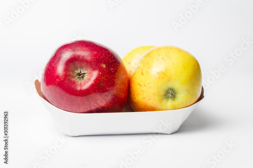 Red and yellow apples in a package on a white background