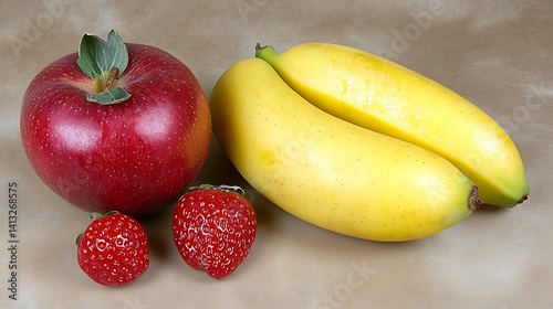 Red apple, bananas, and strawberries