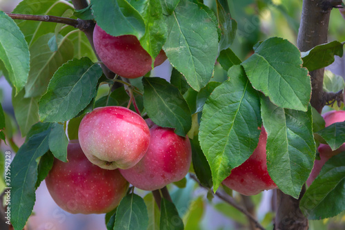 Red apples grow on tree branches in the garden. Autumn harvest concept, eco products. Close-up, selective focus