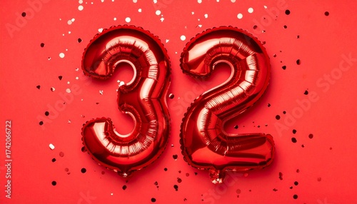 Red balloon number 32 with confetti on solid colored background. Photo for anniversary or birthday party