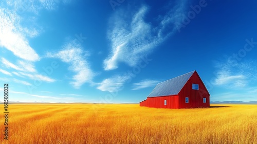 Red barn in a golden field under a vibrant sky