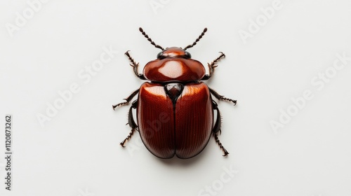 Red beetle close-up isolated on white background showcasing intricate details of its glossy exoskeleton and distinct features for educational use