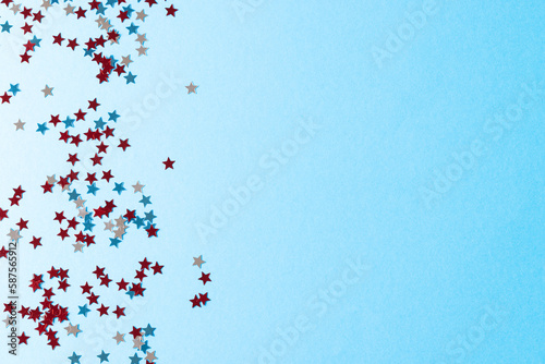 Red, blue and white stars of flag of united states of america with copy space on blue background