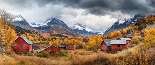 Red cabins nestled in a vibrant autumn valley, framed by snow-capped mountains.