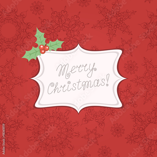Red Christmas card with frame and holly on seamless pattern with snowflakes. Vector illustration