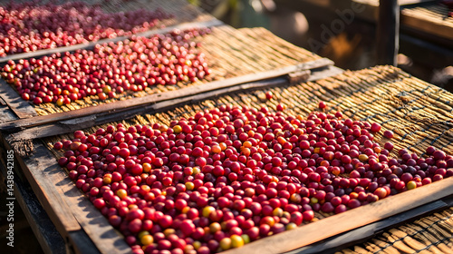 Red coffee cherries drying on woven mats outdoors in sunlight.