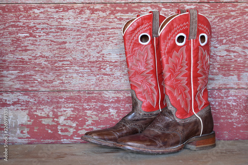 red cowboy boots on red barn board