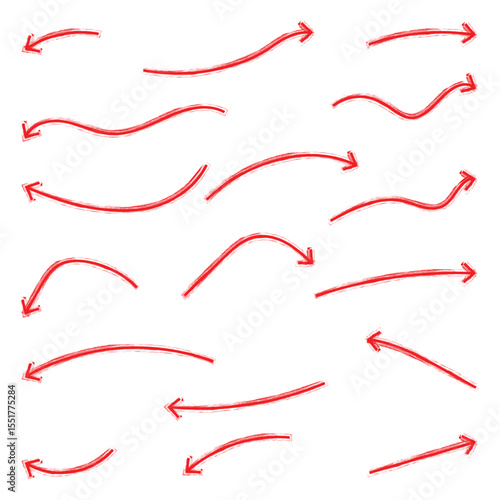 Red crayon arrow doodles collection - hand sketched curved lines, round swirls, pointers. Artistic scribbles, design elements set.