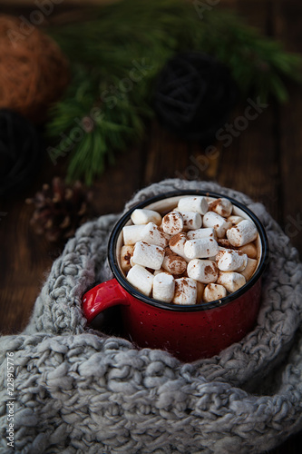 red Cup with marshmallow on wooden new year background