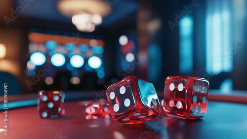 Red dice rolling on the table in the casino, game of luck and chance, gamble