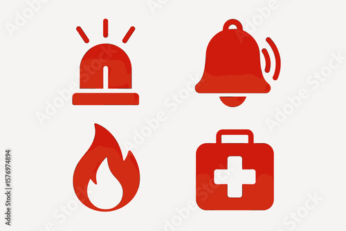 Red emergency symbols: alarm, bell, fire, and first aid icons on white background