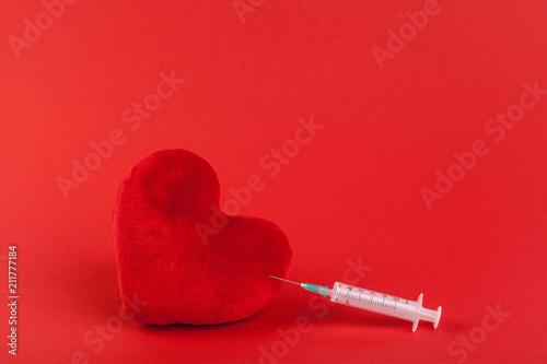 Red fabric toy heart and syringe, health concept