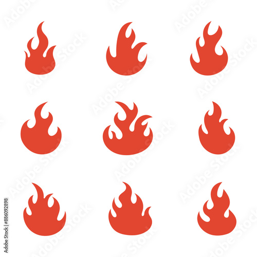 Red fire flames silhouettes set. Flat red fire icons isolated on white background