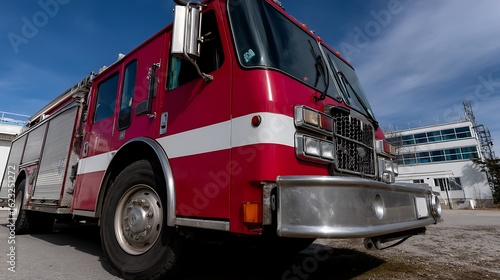 Red Fire Truck Parked Under Blue Sky with Emergency Vehicle Ready for Duty.