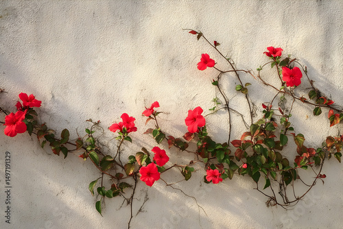 Red flowers climbing a light gray stucco wall.
