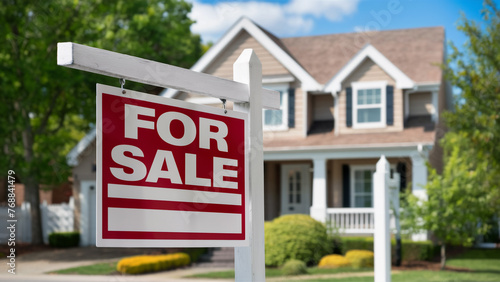 Red 'For Sale' sign in front of an upscale suburban home