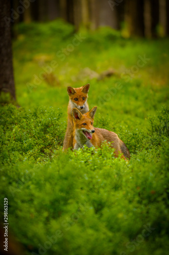 Red fox, vulpes vulpes, adult fox with young