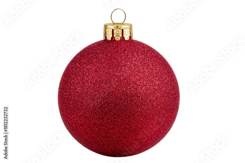 Red glitter Christmas ornament ball with gold cap, festive decoration for holiday tree, isolated on transparency background, symbolizing celebration and joyful winter season