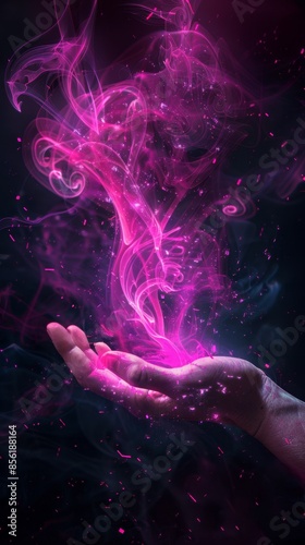 Red Glowing Fantasy Hand Concept. Drifting Magical Fantasy with Neon Smoke on Black Background. Witchcraft. Glowing Palm. Surreal Energy Glow. Halloween, Christmas. High-Resolution Wallpaper. AI-Gener