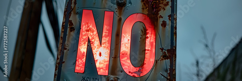 red glowing NO letters in a rusted street sign
