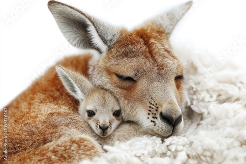 Red kangaroo mother and joey sleeping peacefully on white wool