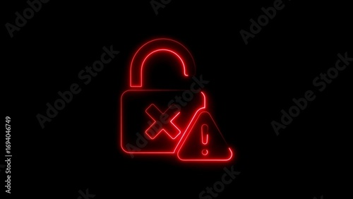 Red neon unlocked padlock with cross and warning sign indicating error security breach