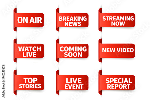 Red news banners with white text for live streaming and breaking news