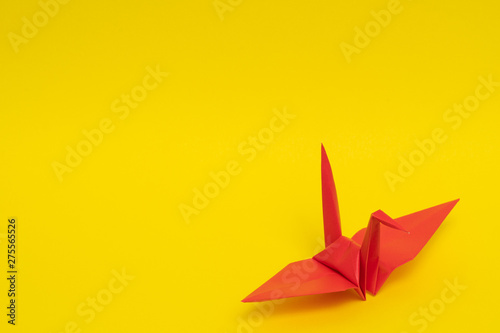 red origami paper crane on yellow background
