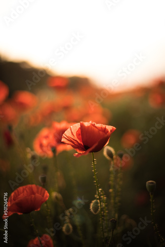 Red poppy flower in wild field. Evening mood with sunlight. natural flower in summer.