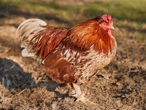 Red rooster in warm light in the garden