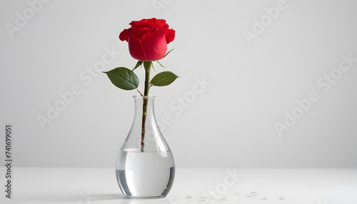 Red rose in a vase on a white background, space for text. Generative AI