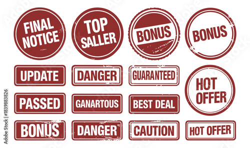 Red rubber stamp labels with promotional and warning phrases in vintage distressed style for marketing design use