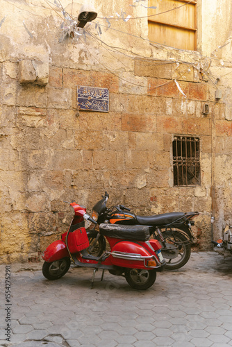 Red scooter parked next to old stone wall in cairo