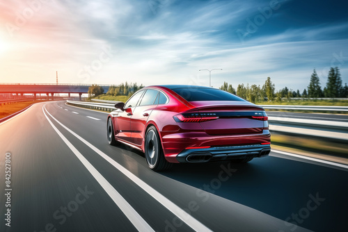 red, sedan, car, highway, road, driving, sunset, travel, transportation, asphalt, lane, speed, motion, blur, landscape, evening, sun, sky, cloud, tree, vehicle, automotive, automobile, modern, sleek, luxury, fast, journey, adventure, freedom, open, destination, drive, enthusiast, photo, trip, lover, photo, photograph