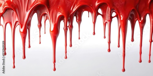 Red slime drips slowly onto a stark white surface creating intricate patterns and textures, viscosity effect, dynamic image, dripping slime