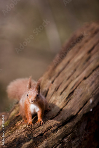 Red squirrel on a tree trunk