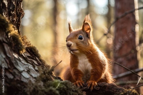 Red squirrel perched on a tree in a springtime park. Generative AI