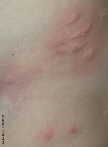 Red, swollen and itchy spots on skin caused by insect bites or allergy. Skin reaction to insect bites.
