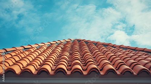 Red Tile Roof Under Blue Sky with Vintage Filter, Classic Architecture