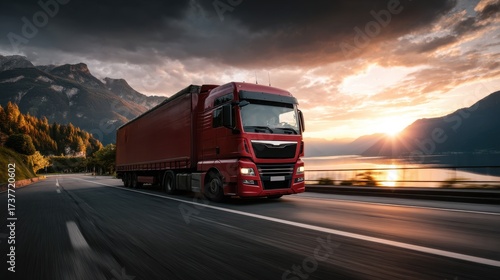Red Truck Driving on Scenic Road by Lake with Mountains and Sunset, Capturing Transportation and Nature in Perfect Harmony