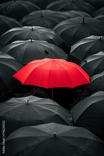 Red umbrella stand out from the crowd of many black and white umbrellas. Business, leader concept, being different concepts