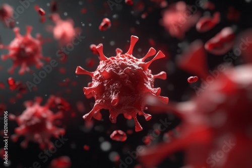 Red virus particles floating in a dark environment with dramatic lighting highlighting their details